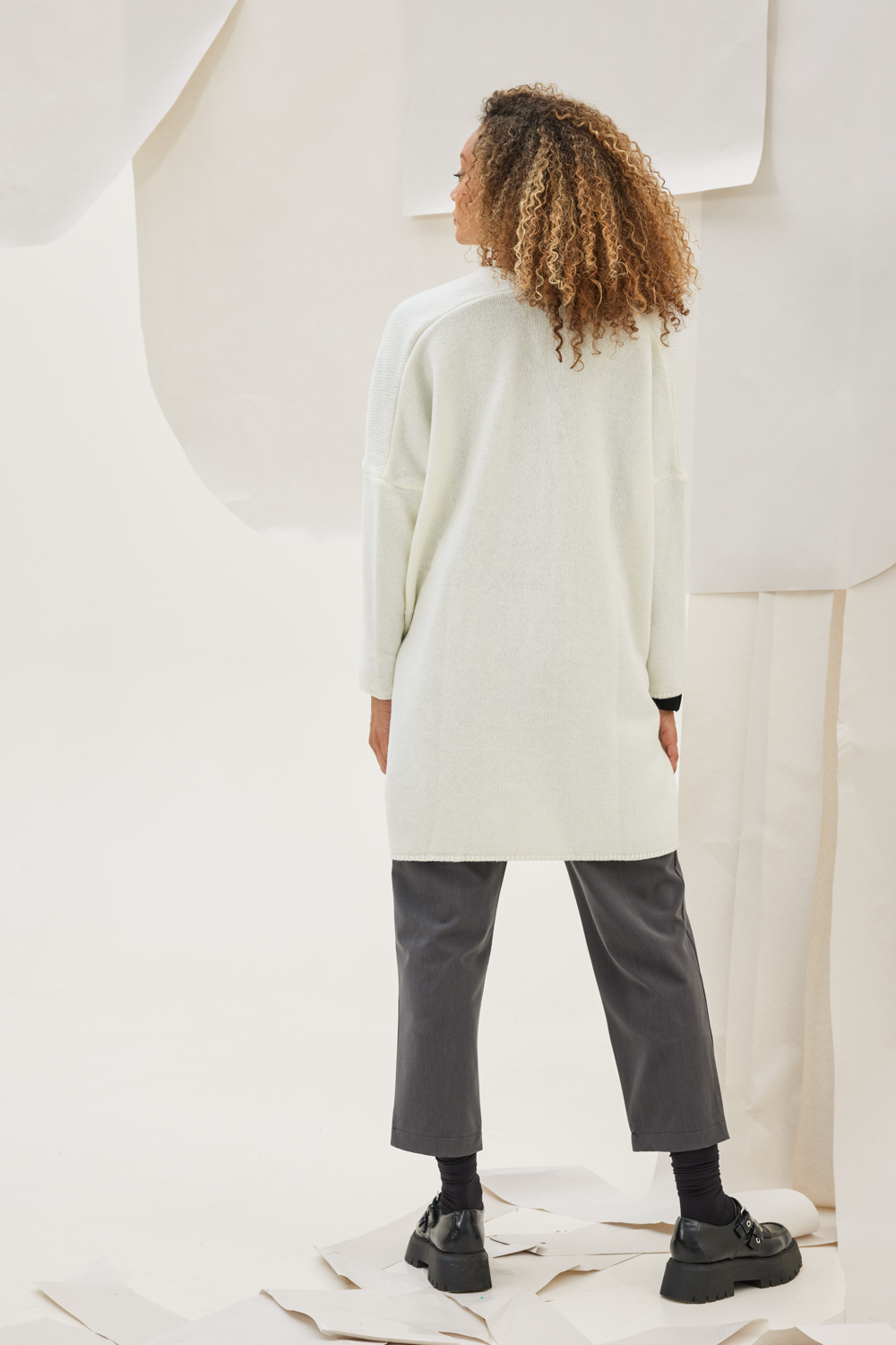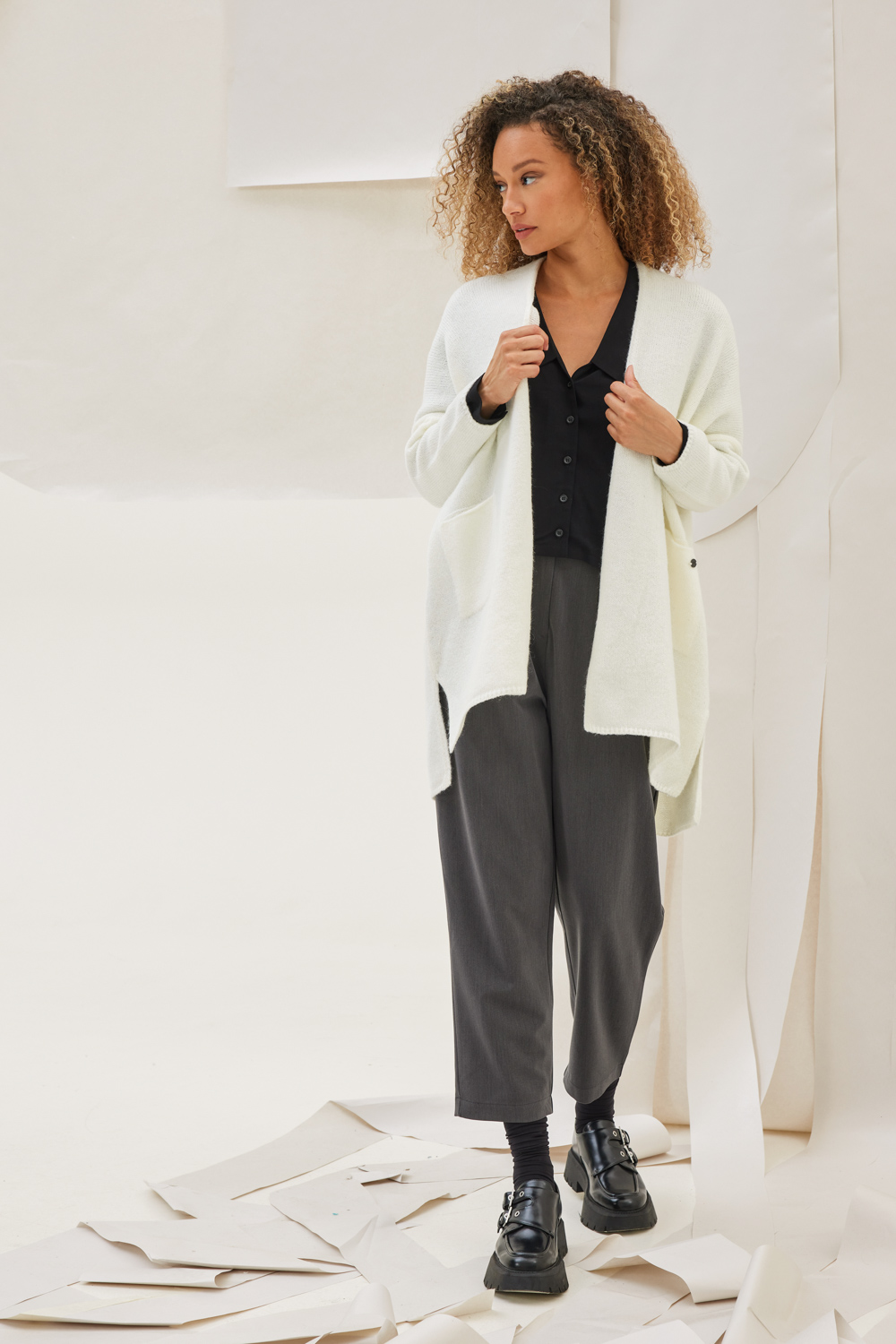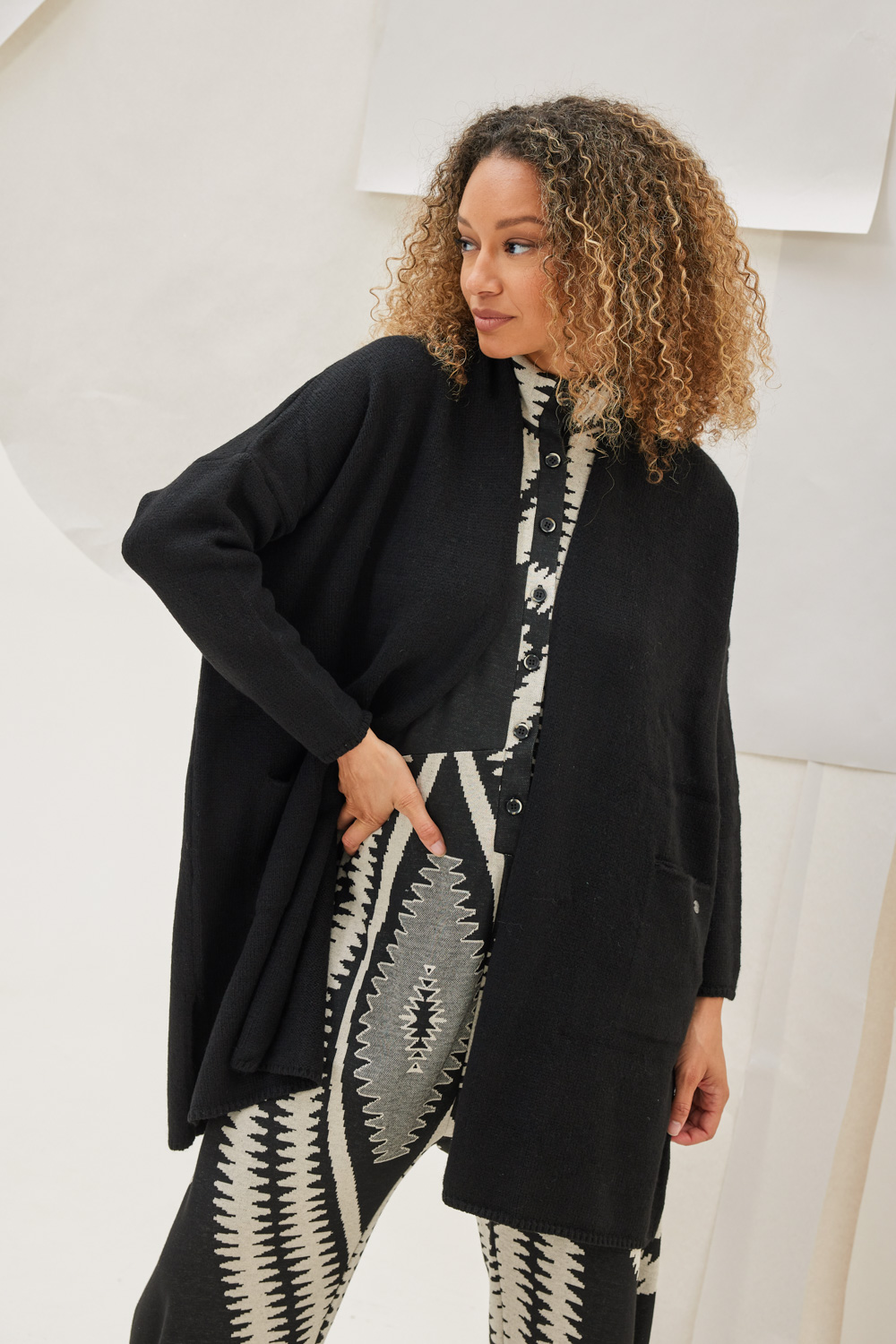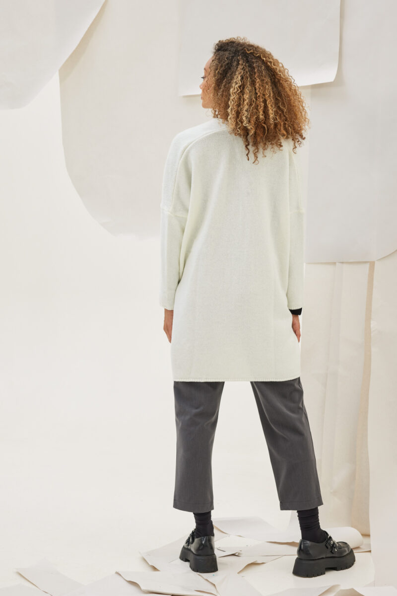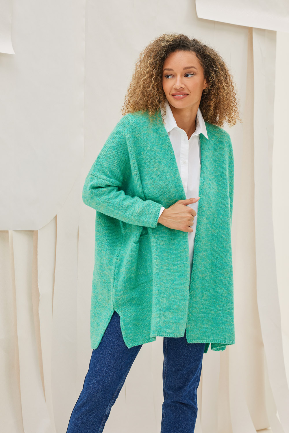 Ζακέτα πλεκτή μακρυμάνικη χωρίς κούμπωμα με τσέπες εμπρός και ανοίγματα στο πλάι.
