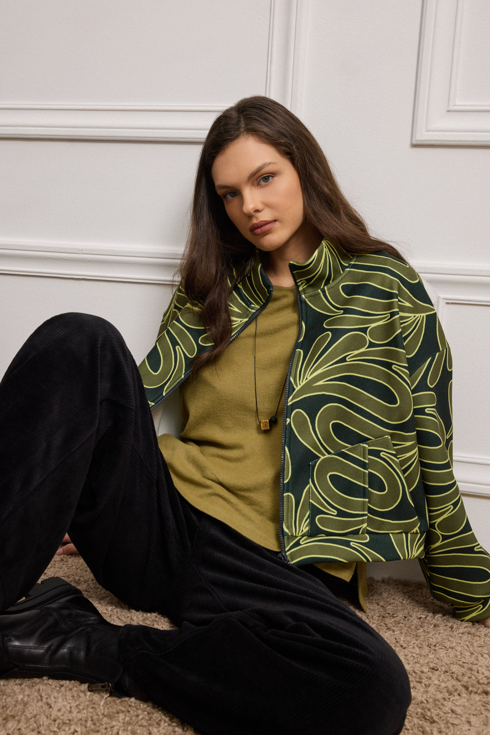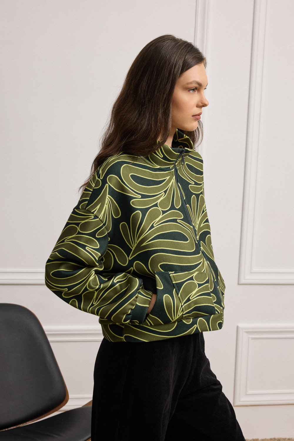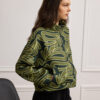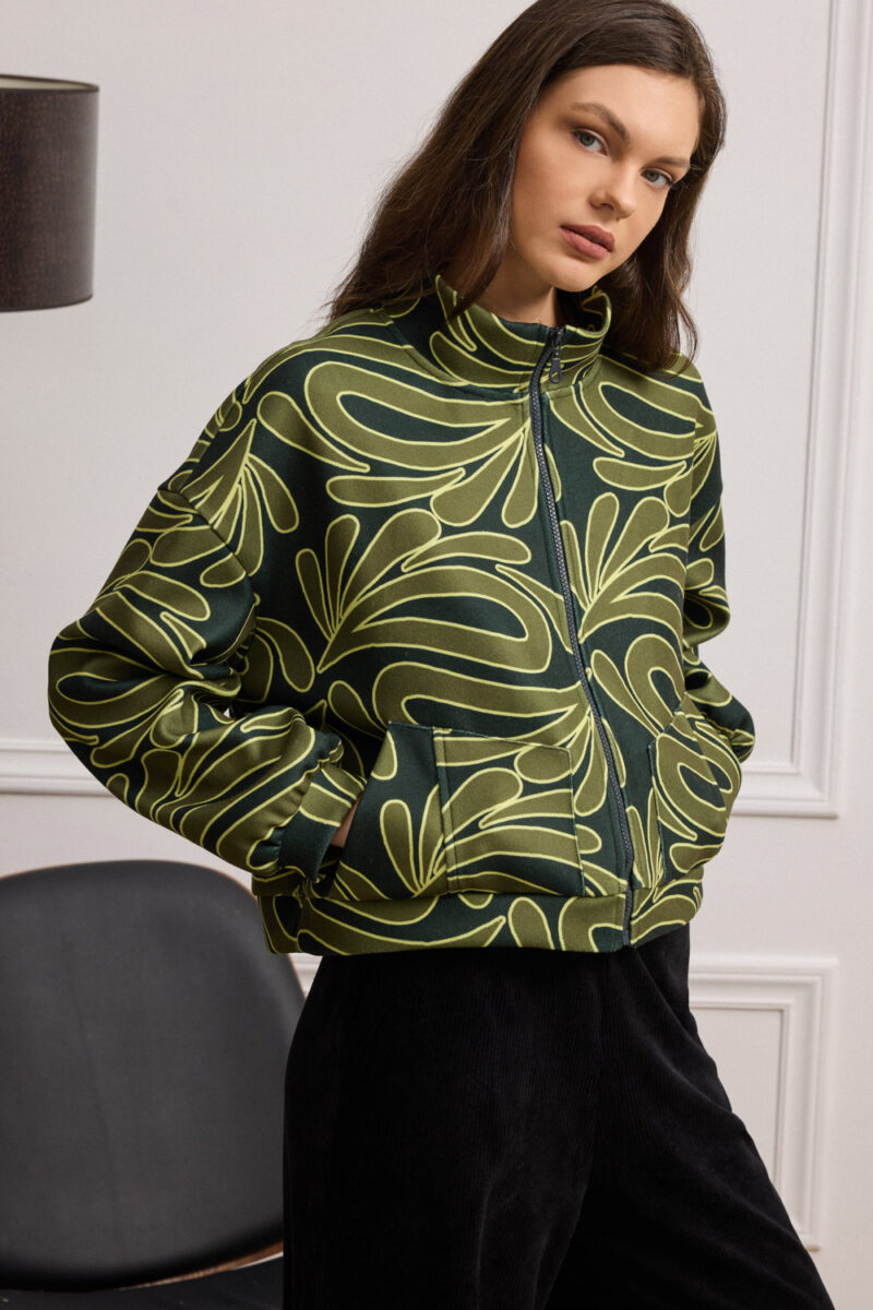 Μπουφάν με ξεκάθαρη σχεδιαστική ταυτότητα, σε χοντρό ζέρσεϊ ύφασμα, που ξεχωρίζει για το αφαιρετικό print, προσθέτοντας ενέργεια και χαρακτήρα σε κάθε εμφάνιση. Σχεδιασμένο σε χαλαρή γραμμή με ήπια καμπυλότητα στη βάση. Ο ψηλός γιακάς πλαισιώνει εντυπωσιακά το πρόσωπο και οι σχεδιαστικές ραφές στις τσέπες προσθέτουν γραμμικότητα ενώ το μπροστινό φερμουάρ εξασφαλίζει πρακτικότητα. Στα μανίκια, η φάσα με σούρα προσθέτει όγκο και ιδιαίτερο στιλιστικό twist.