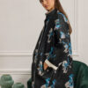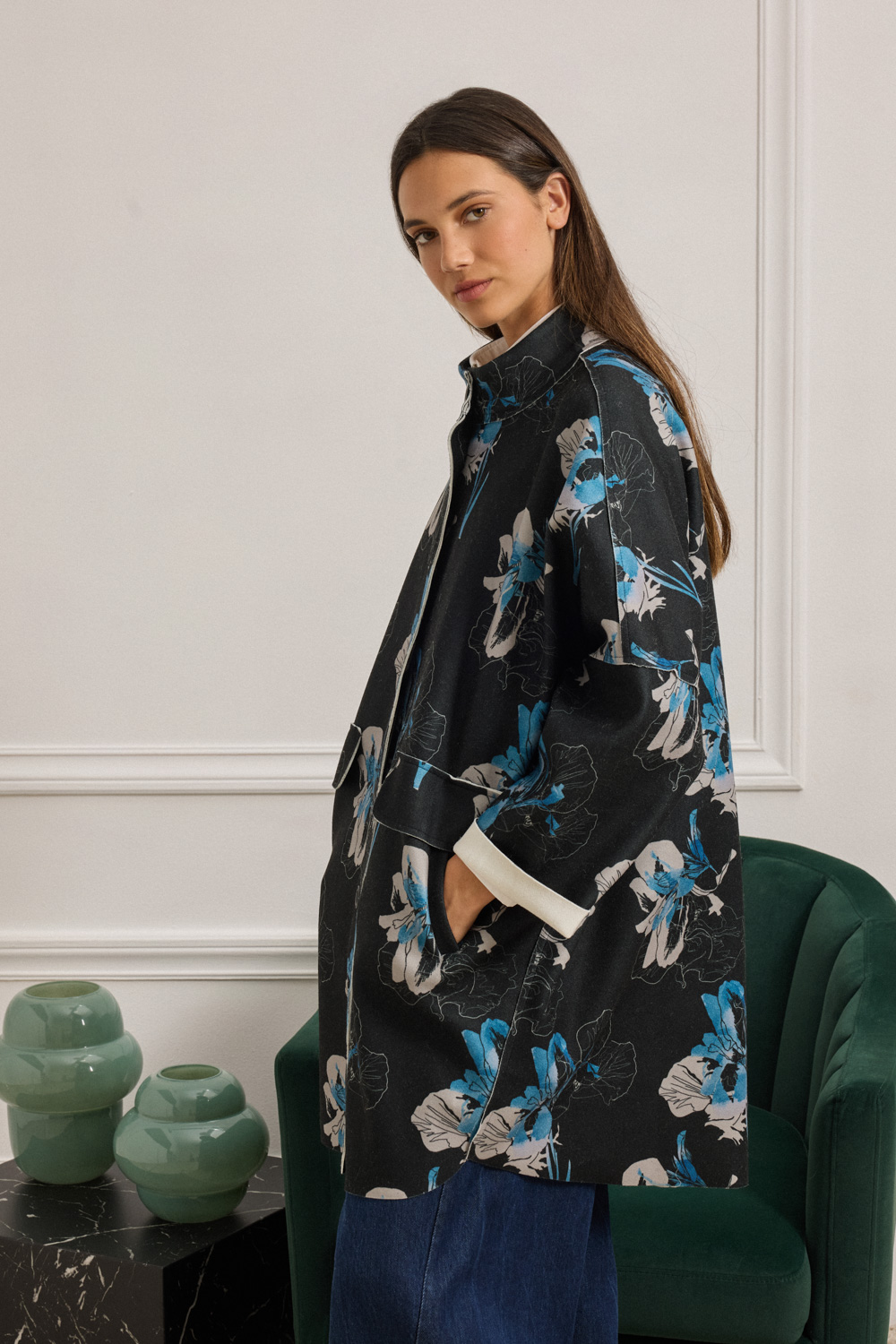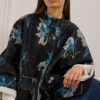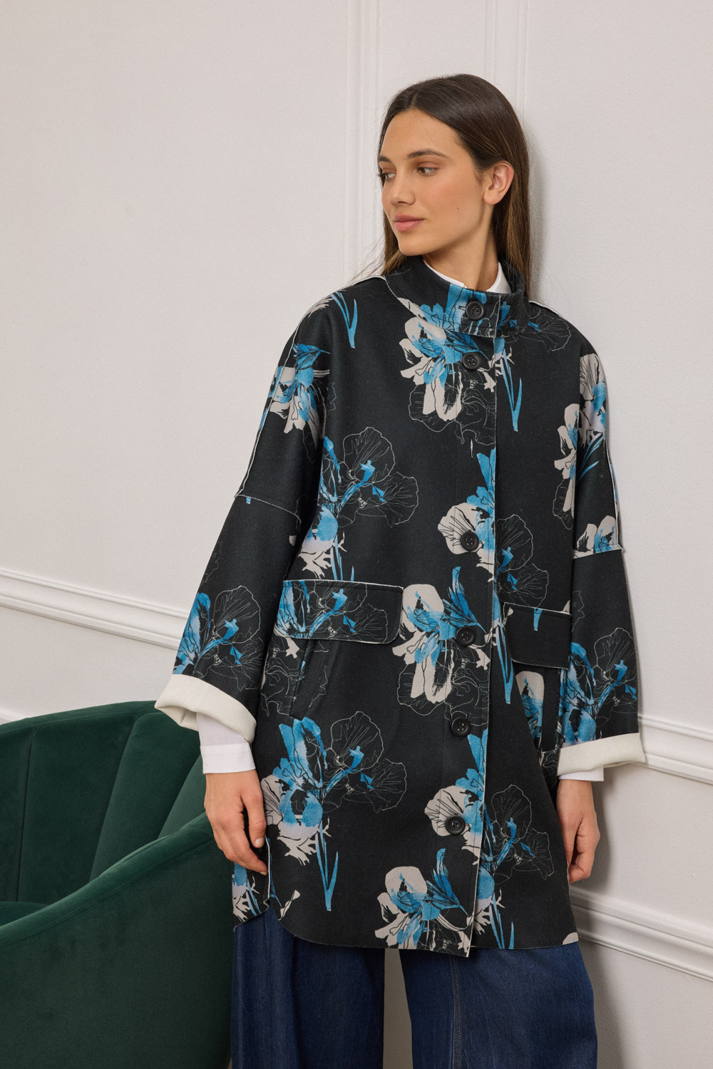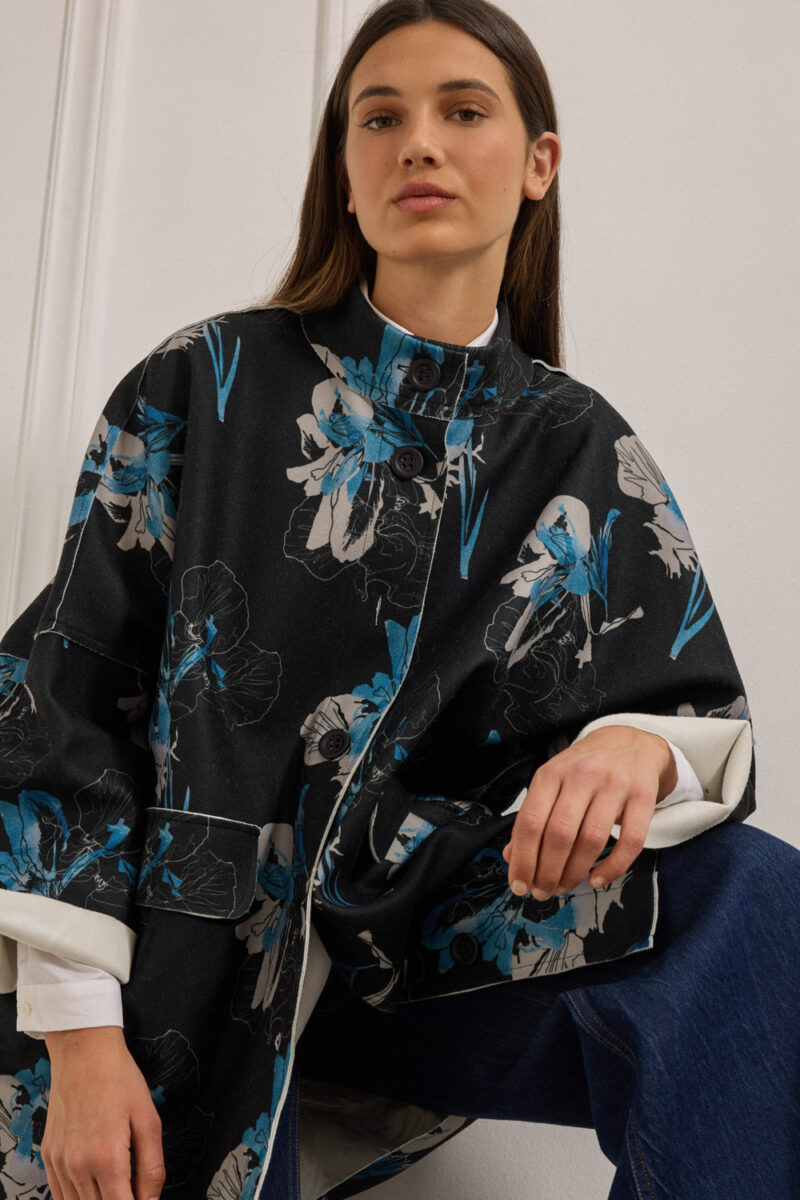 Πάνωφόρι oversized με μοντέρνα ασυμμετρία και μήκος που δεν ξεπερνά το γόνατο με εντυπωσιακό floral print. Το ύφασμα έχει σταθερή, ελαφρώς δομημένη υφή που διατηρεί το σχήμα του, χαρίζοντας καθαρή, γεωμετρική γραμμή. Ο γιακάς στέκεται όρθιος και προσδίδει σύγχρονο χαρακτήρα. Τα μακριά μανίκια με χαμηλωμένους ώμους και οι μεγάλες τσέπες με καπάκι ολοκληρώνουν το σχεδιαστικό σύνολο. Διαθέτει κουμπιά σε όλο το μήκος.