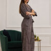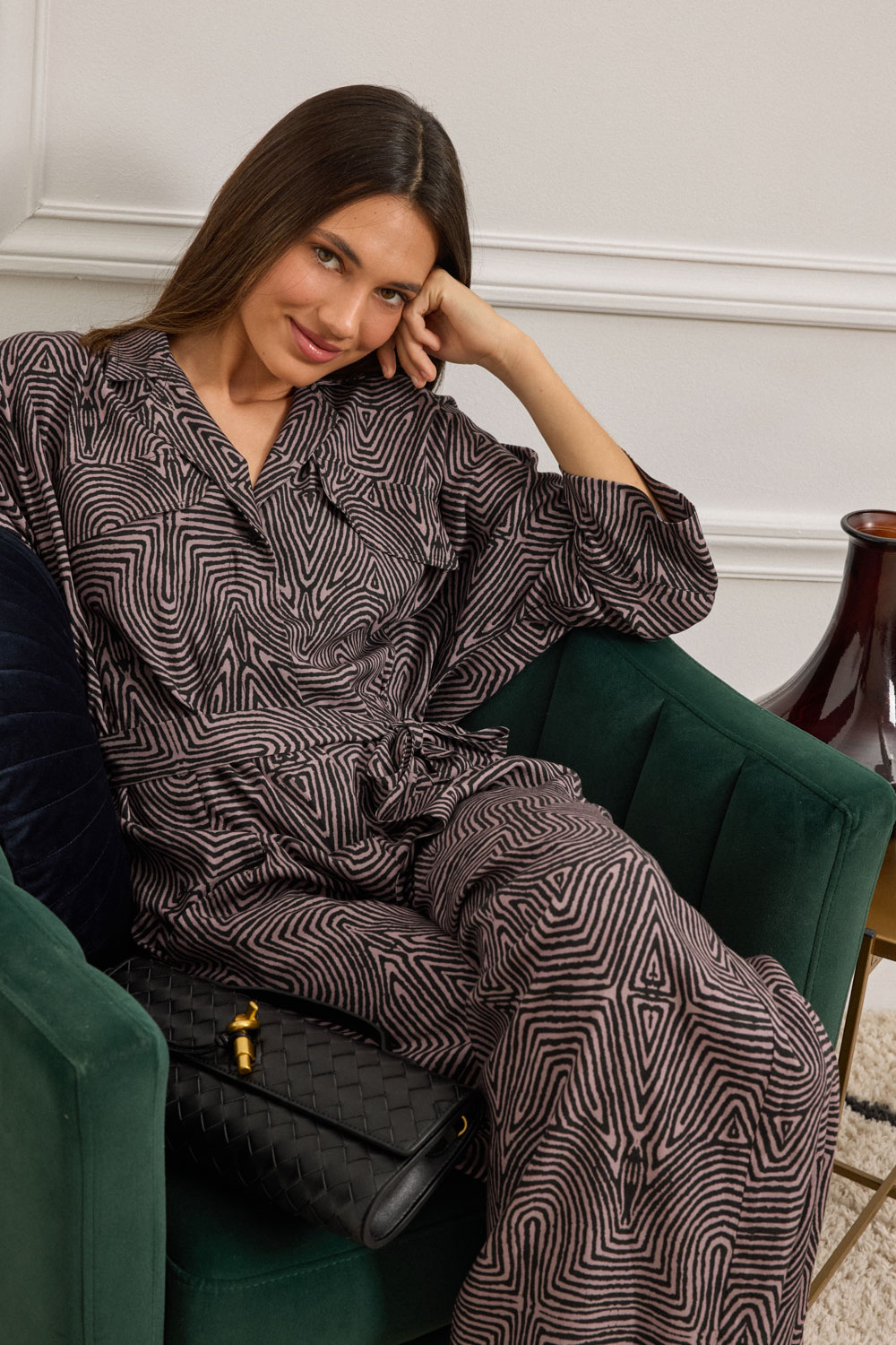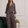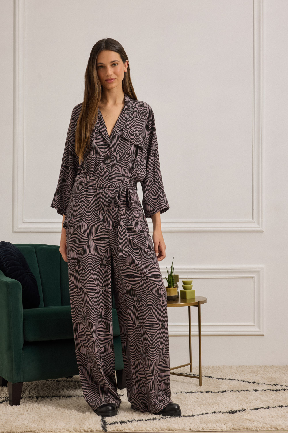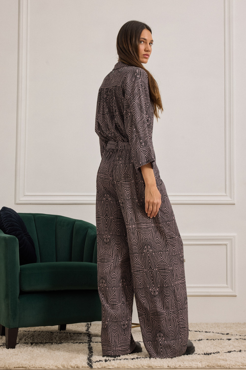 Ολόσωμη φόρμα με γιακά πέτο, από 100% βισκόζη, με γεωμετρικό print συνδυάζει άνεση και κομψότητα. Κλείνει μπροστά με φερμουάρ και κουμπί, ενώ διαθέτει διακοσμητικά καπάκια τσέπης μπροστά, και τσέπες με καπάκι για πρακτικότητα. Η άνετη γραμμή της και τα 3/4 μανίκια ζαπονέ προσφέρουν άνεση, ενώ τα θηλάκια με ζώνη από το ίδιο ύφασμα δίνουν δυνατότητα ρύθμισης στη μέση. Οι σούρες στα πλαϊνά και στο πίσω μέρος αναδεικνύουν διακριτικά τη σιλουέτα. “Αυτό το προϊόν έχει φτιαχτεί με αγάπη και σεβασμό στο περιβάλλον χρησιμοποιώντας φυσικές ίνες.”