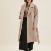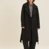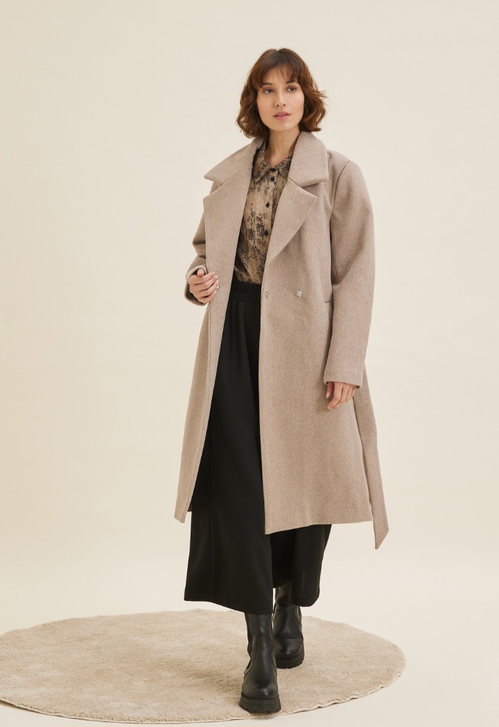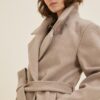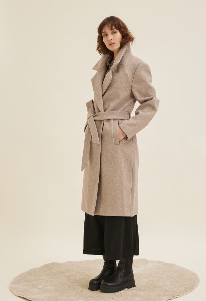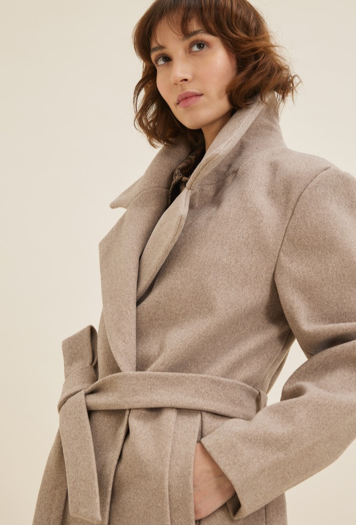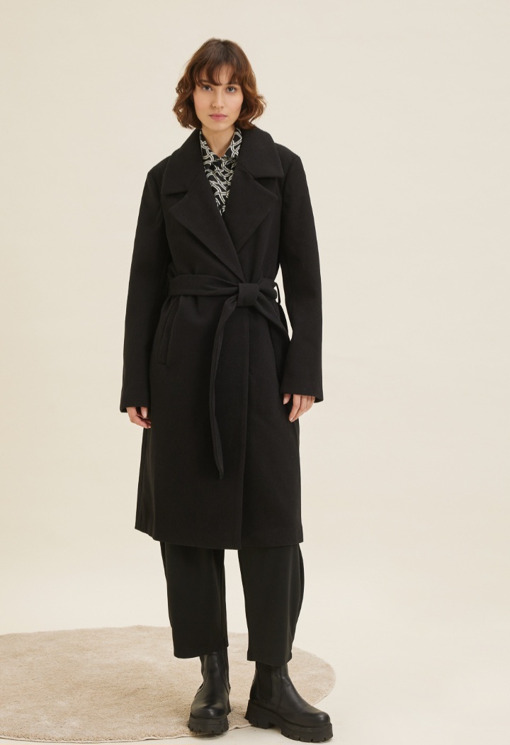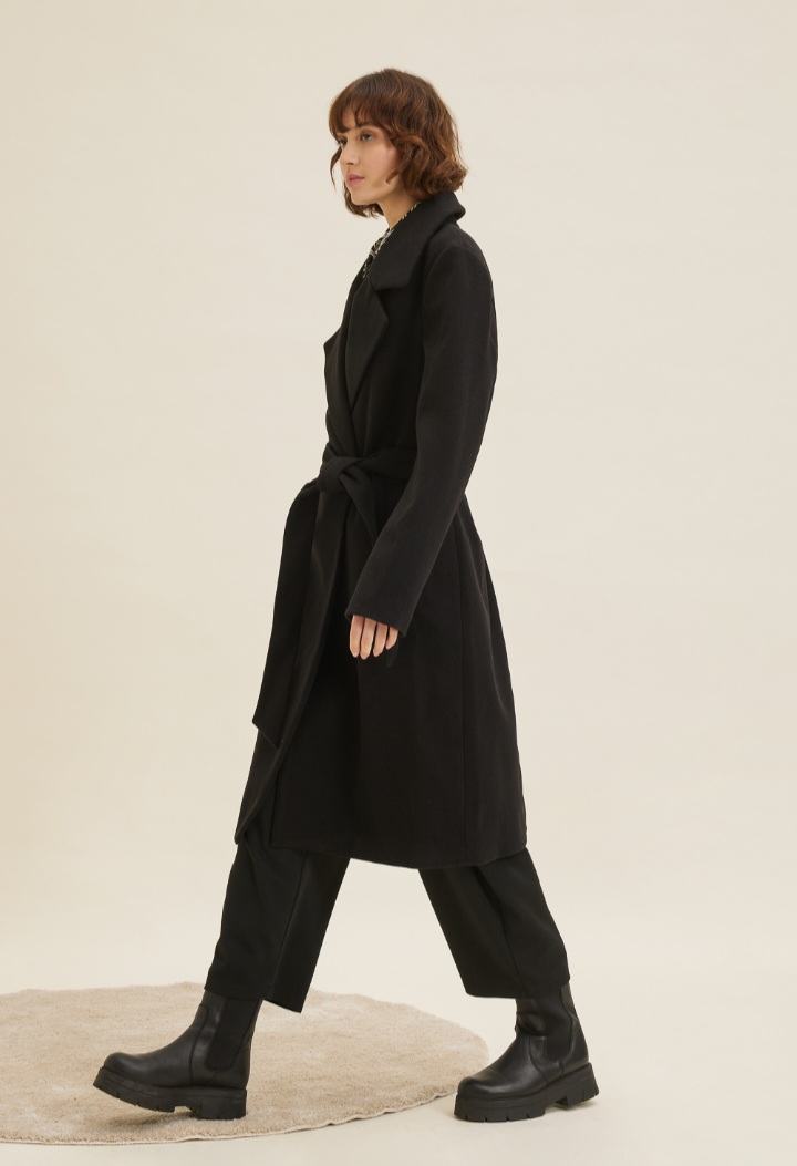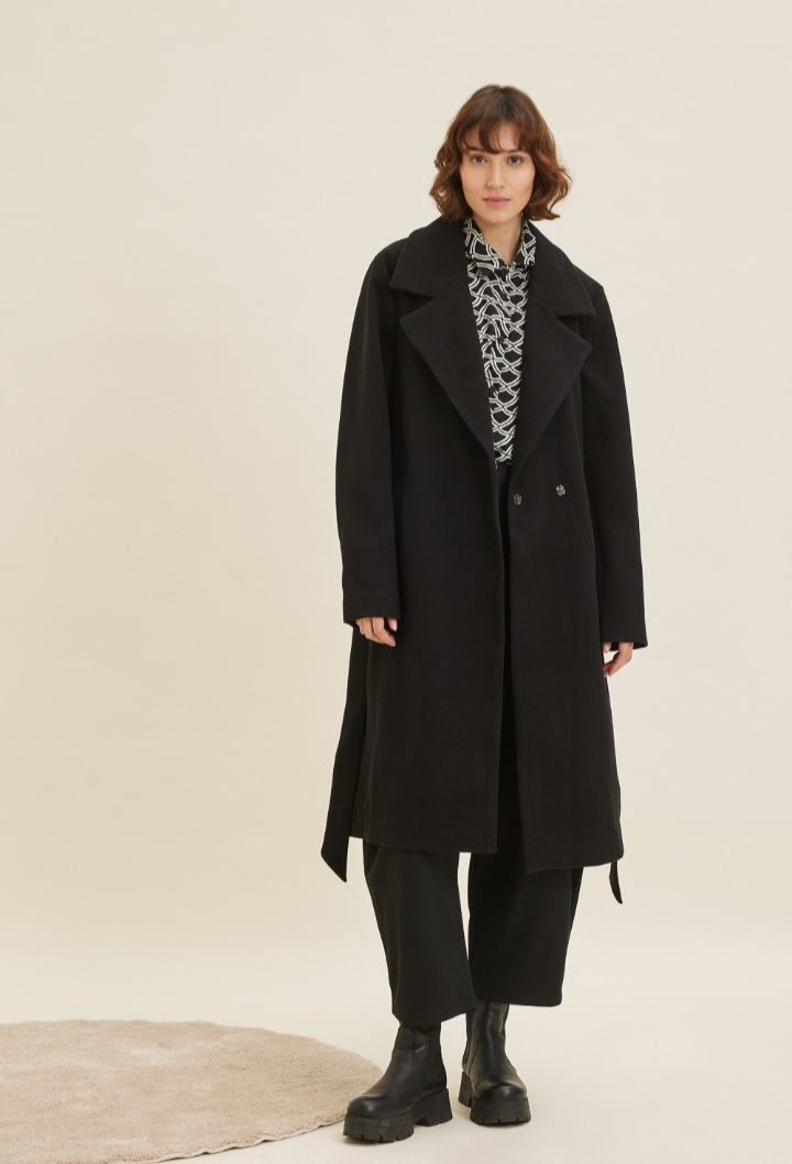 Παλτό με πέτο γιακά, κρυφό σταυρωτό κούμπωμα, κοφτές τσέπες με φάσα, ραφή στο κέντρο πίσω με σχίσιμο στο τελείωμα και αποσπώμενη ζώνη από το ίδιο ύφασμα. Το ύφασμα είναι βελούρ.