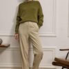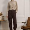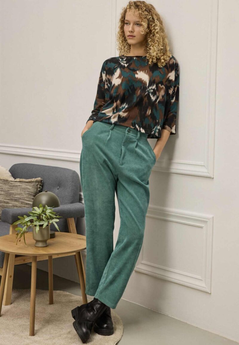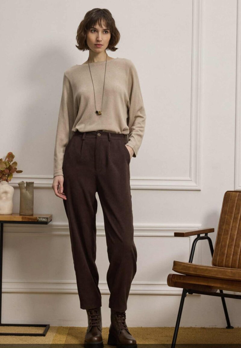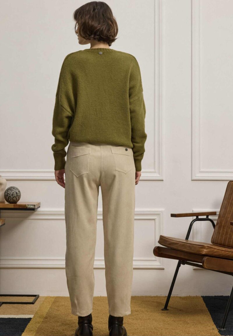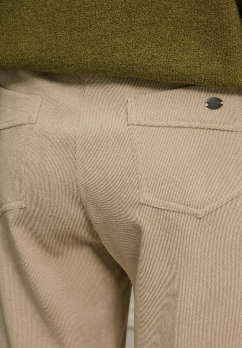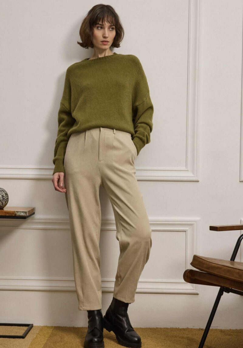 Παντελόνι κλασικό, διαχρονικό και ταυτόχρονα απόλυτα σύγχρονο. Είναι φτιαγμένο από απαλό κοτλέ ύφασμα που χαρίζει βάθος με διακριτική ελαστικότητα, προσφέροντας άνεση στην κίνηση. Διαθέτει ψηλόμεση γραμμή που αγκαλιάζει τη μέση, πιέτες μπροστά που χαρίζουν δομή, και λάστιχο στο πίσω μέρος για άψογη εφαρμογή. Το τελείωμα έχει πένσες που δημιουργεί ελαφρώς tapered γραμμή. Περιλαμβάνει πλαϊνές και πίσω τσέπες με διακριτικό φινίρισμα, και θυλάκια για ζώνη, ενώ το κλείσιμο μπροστά γίνεται με κουμπί και φερμουάρ.