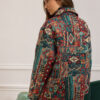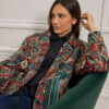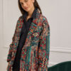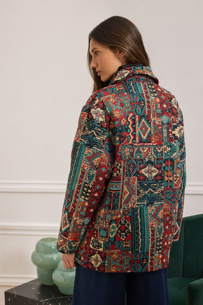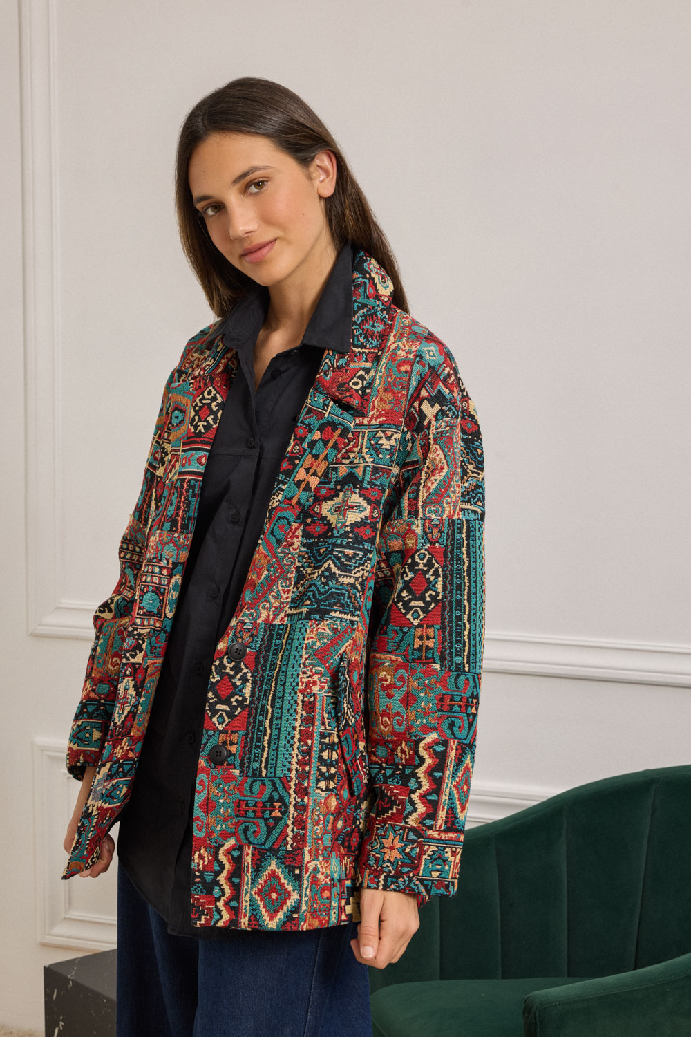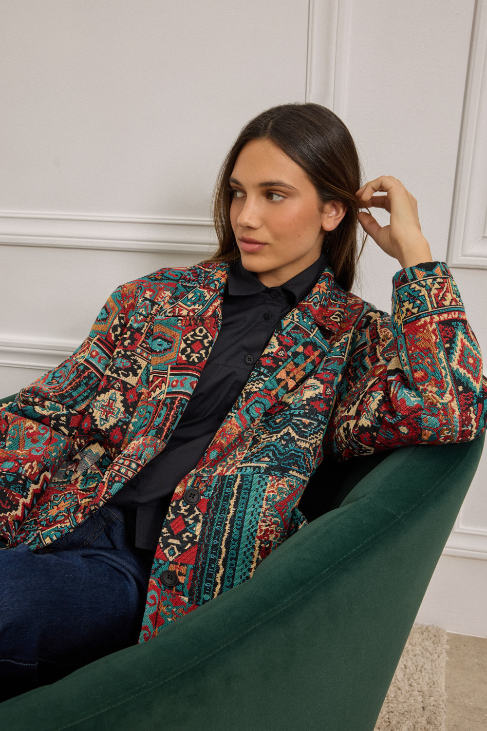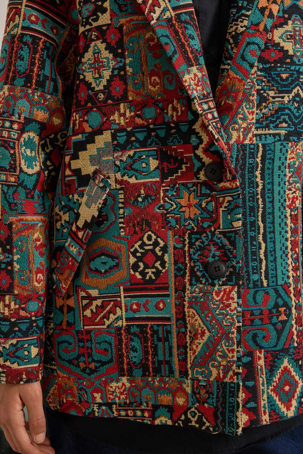 Πανωφόρι με δομημένη γραμμή και εντυπωσιακό ύφασμα σε υφαντό ethnic μοτίβο. Το πολύχρωμο pattern σε βαθιές αποχρώσεις δίνει ένταση και ξεχωριστό χαρακτήρα. Διαθέτει πέτο γιακά, μακριά μανίκια με χαμηλωμένους ώμους, κουμπιά μπροστά και μεγάλες τσέπες με καπάκι, που ενσωματώνονται στο σχέδιο χωρίς να διακόπτουν το μοτίβο. Η σταθερή ύφανση προσδίδει γεμάτη αίσθηση και κρατά τη φόρμα του αναλλοίωτη. Ένα κομμάτι με προσωπικότητα.