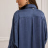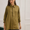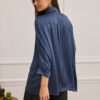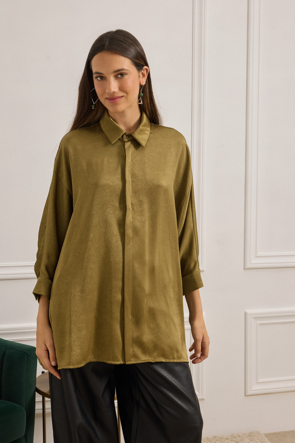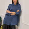 Oversized πουκάμισο από τσαλακωμένο σατέν με ανάλαφρη υφή και διακριτική λάμψη. Κλασικός γιακάς, 3/4 ζαπονέ μανίκια που καταλήγουν σε μανσέτα με κουμπί τονίζει τη χαλαρή του γραμμή. Κλείσιμο με κρυφή πατιλέτα και κουμπιά, ενώ οι σχεδιαστικές ραφές και o ωμίτης προσθέτουν δομή σε ένα διαχρονικό κομμάτι.