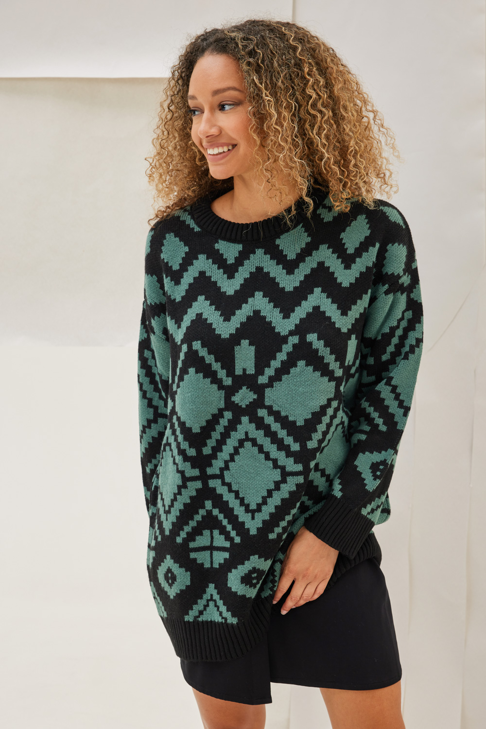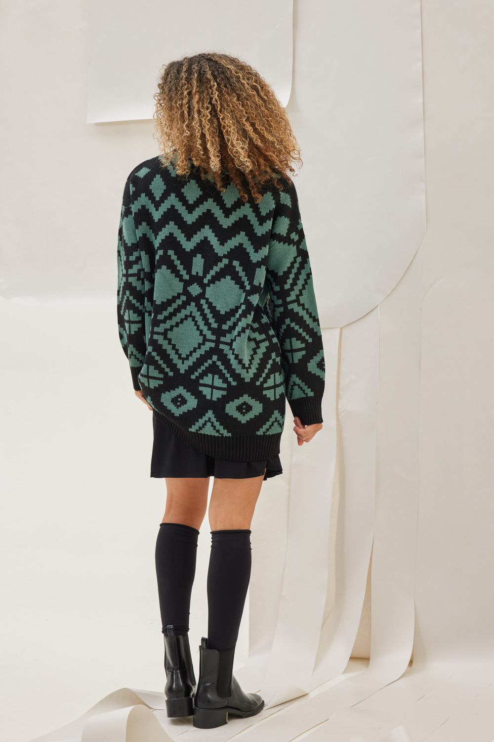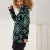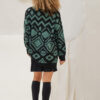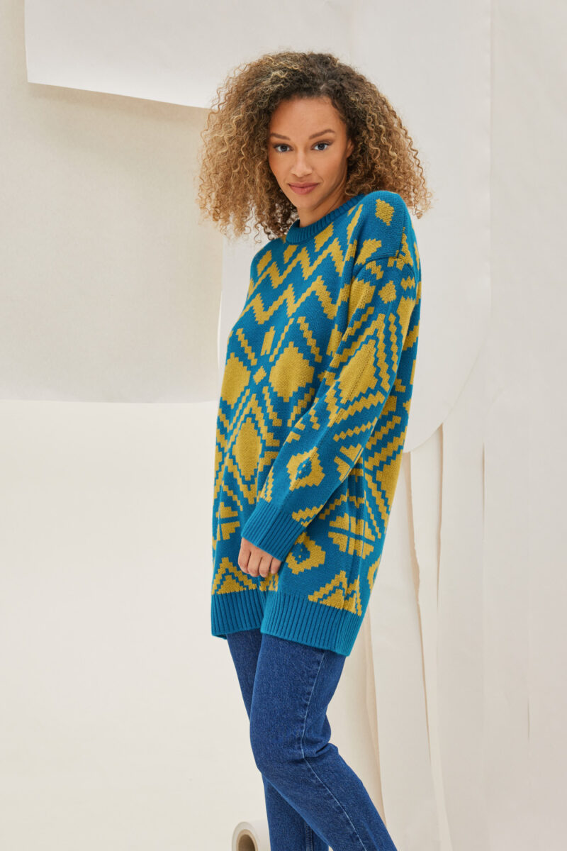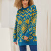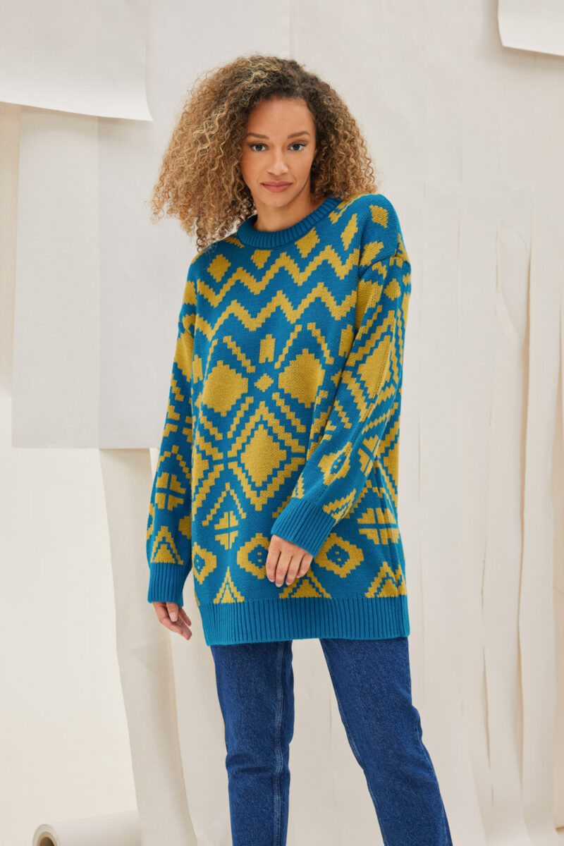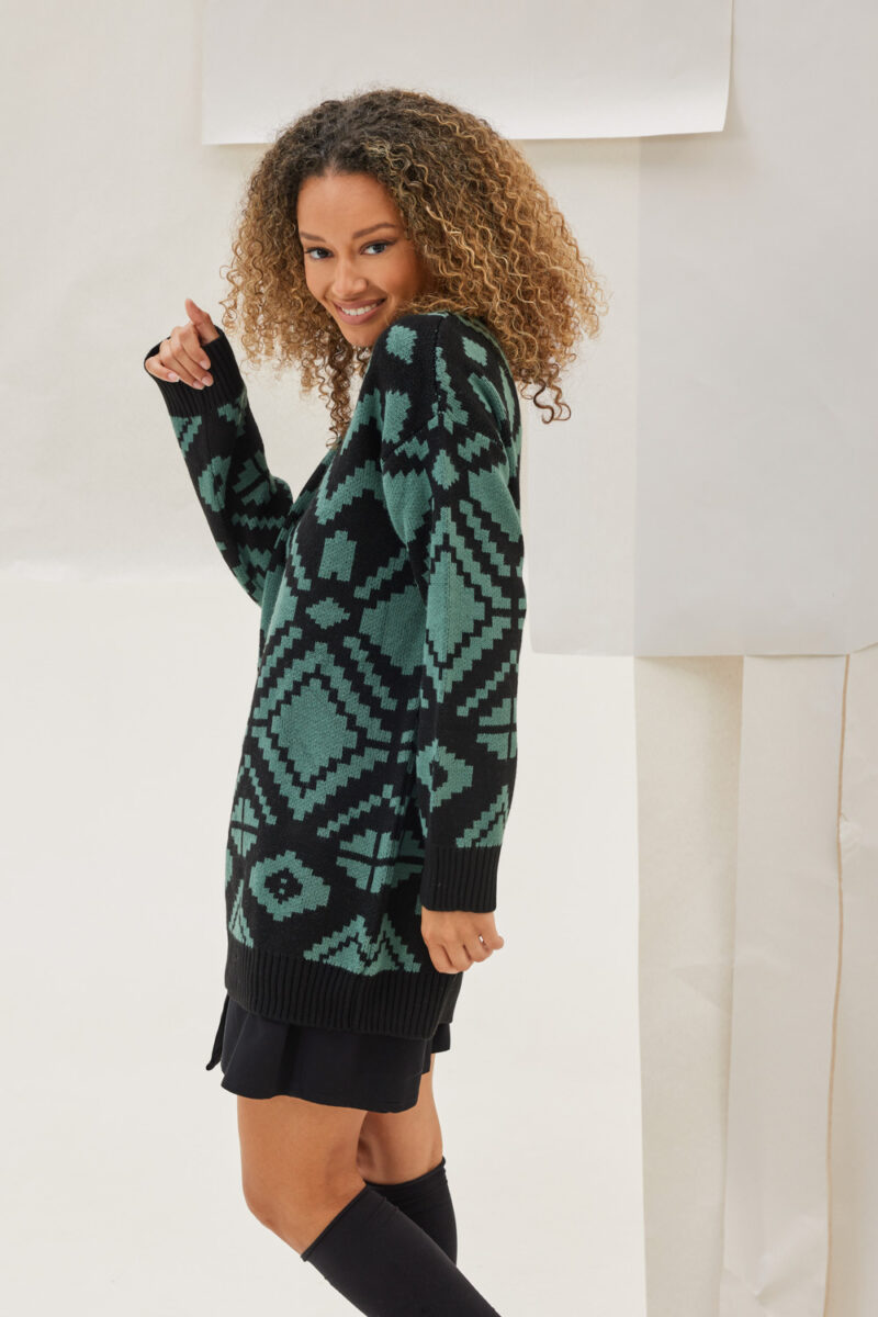 Μακρύ πουλόβερ δίχρωμο με γεωμετρικά σχέδια ,ανοιχτή λαιμόκοψη με μονόχρωμα τελειώματα.