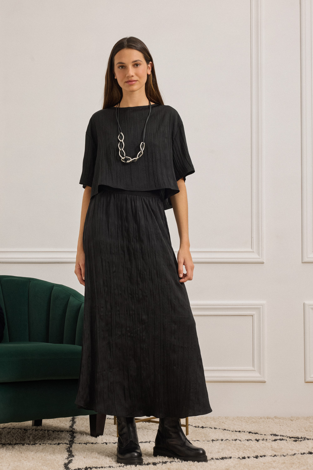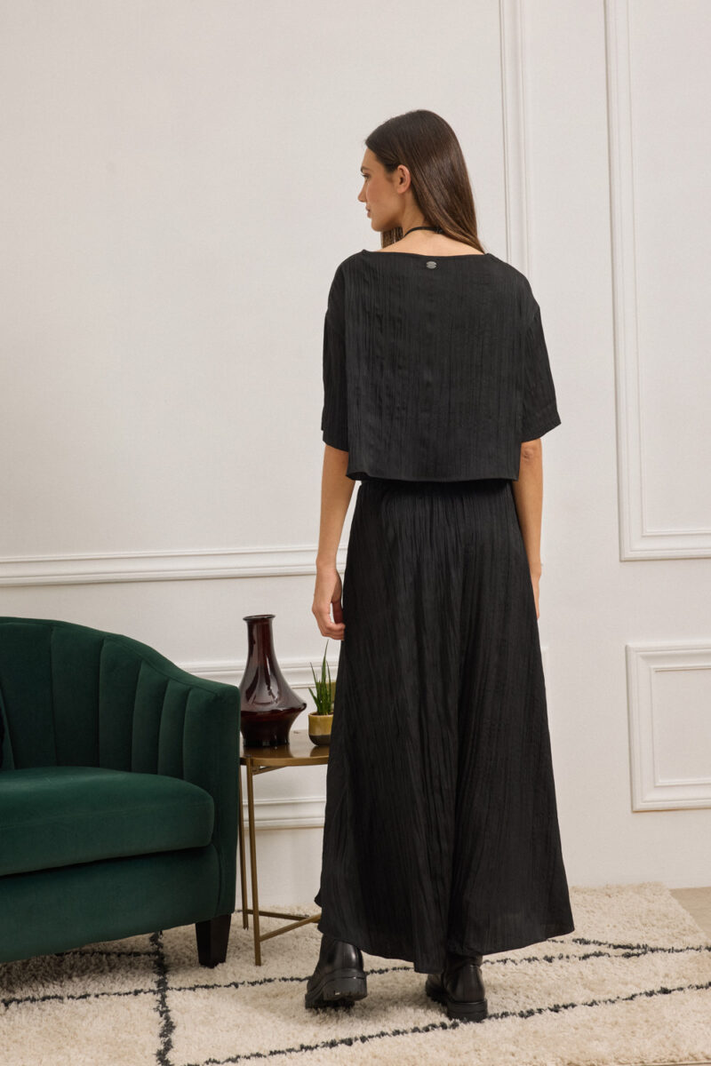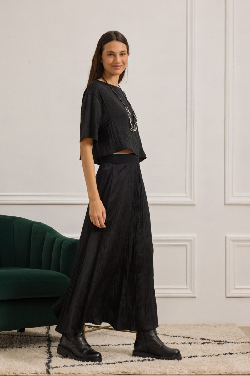 Midi φούστα με χαλαρή γραμμή και δυναμικό paper-touch τσαλακωμένο ύφασμα. Η μέση τονίζεται με λάστιχο και σχέδιο ψαροκόκαλο, ενώ η γραμμή της ανοίγει απαλά προς τα κάτω, δίνοντας κίνηση και στυλ. Συνδυάζεται ιδανικά με την μπλούζα NETTIE για ένα ολοκληρωμένο σύνολο. Το ύφασμα προέρχεται από ανακυκλωμένες ίνες, συνδυάζοντας στυλ και βιωσιμότητα. Μια επιλογή με οικολογική συνείδηση, χάρη στη σύνθεση από REC PES.