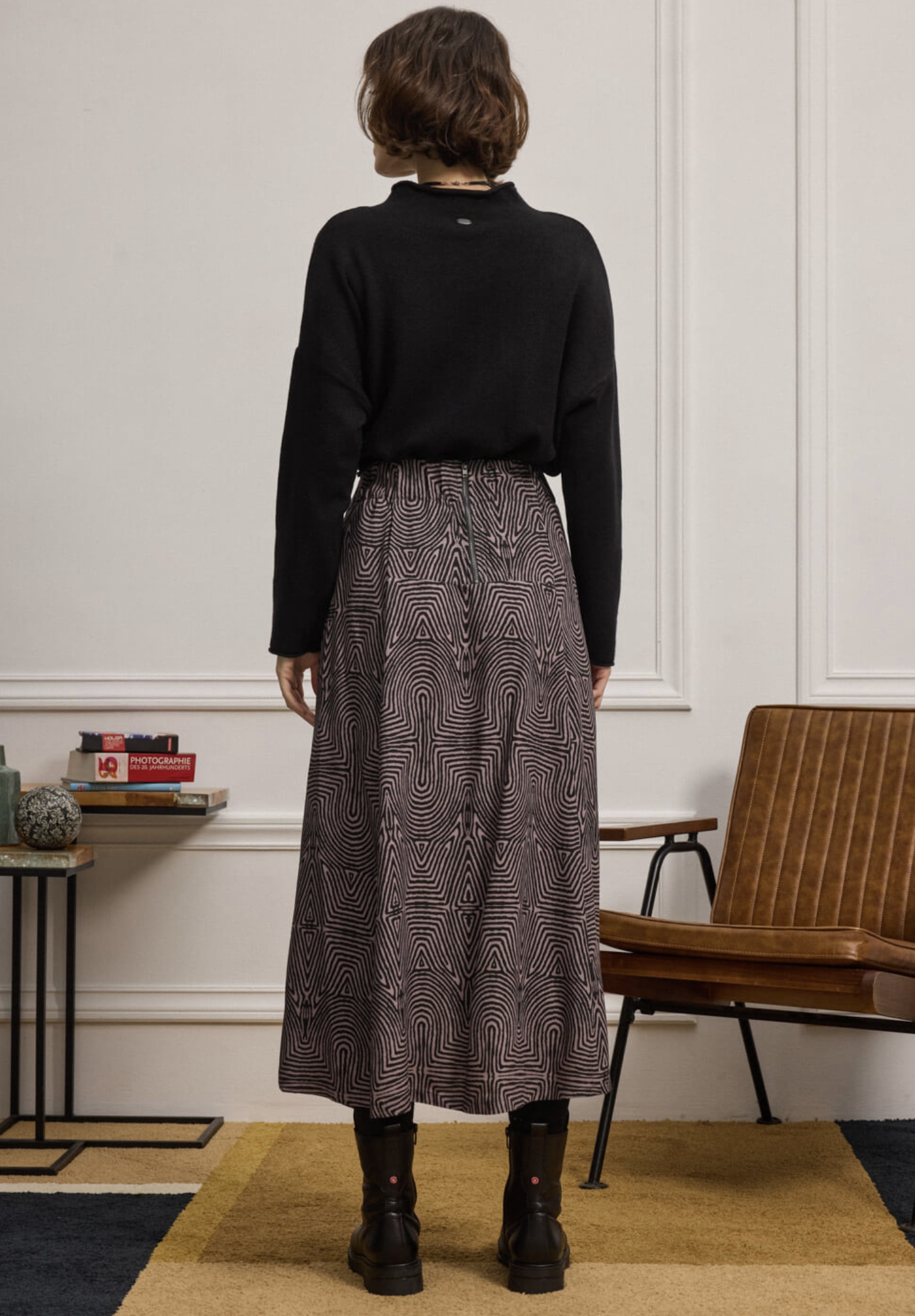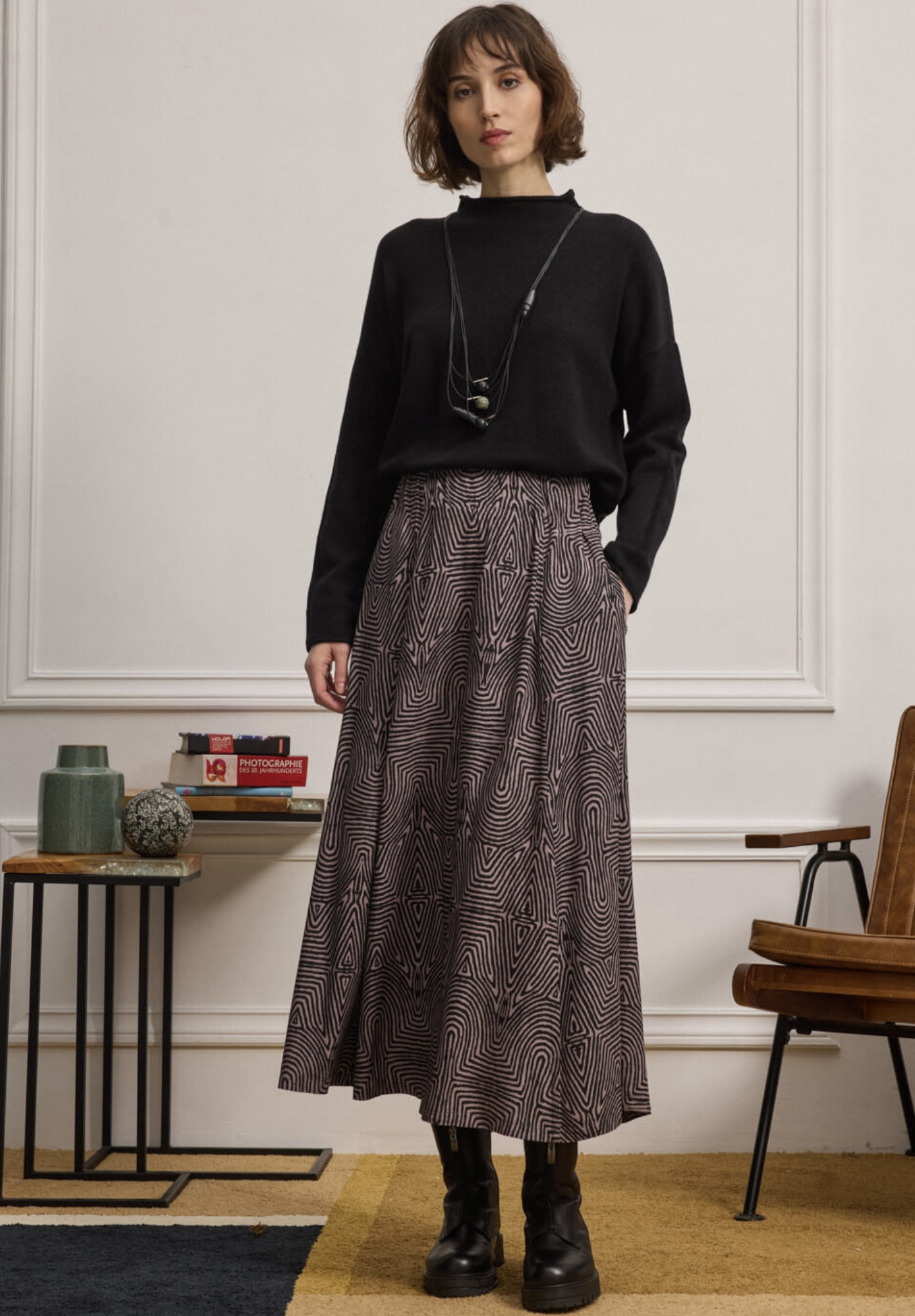 Midi φούστα σε εβαζέ γραμμή, με γεωμετρικό print από 100% βισκόζη . Το λάστιχο στη μέση και το μεταλλικό φερμουάρ στο πίσω μέρος προσθέτει λεπτομέρεια και εξασφαλίζει άνετη εφαρμογή. Διαθέτει πλαϊνές τσέπες και αέρινη γραμμή που κολακεύει τη σιλουέτα. “Αυτό το προϊόν έχει φτιαχτεί με σεβασμό στο περιβάλλον χρησιμοποιώντας φυσικές ίνες.”