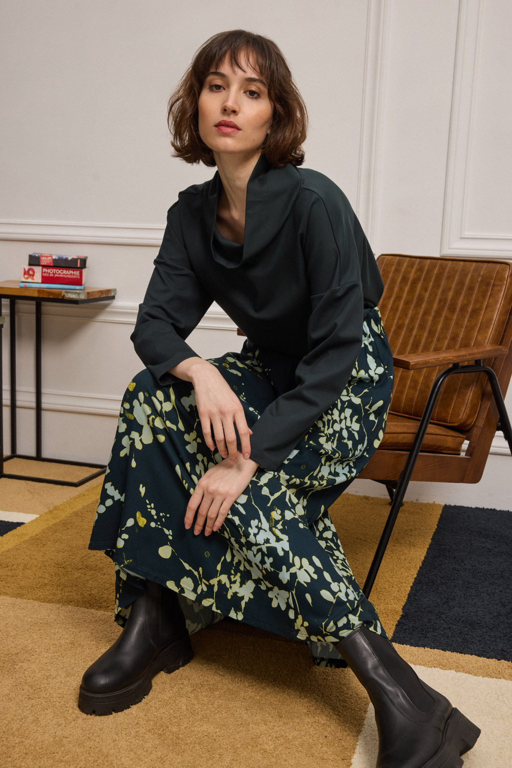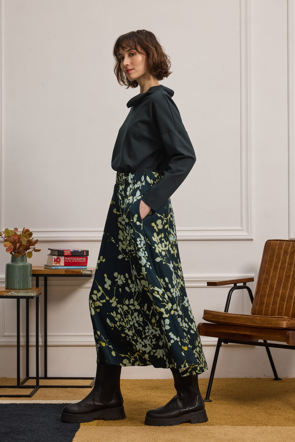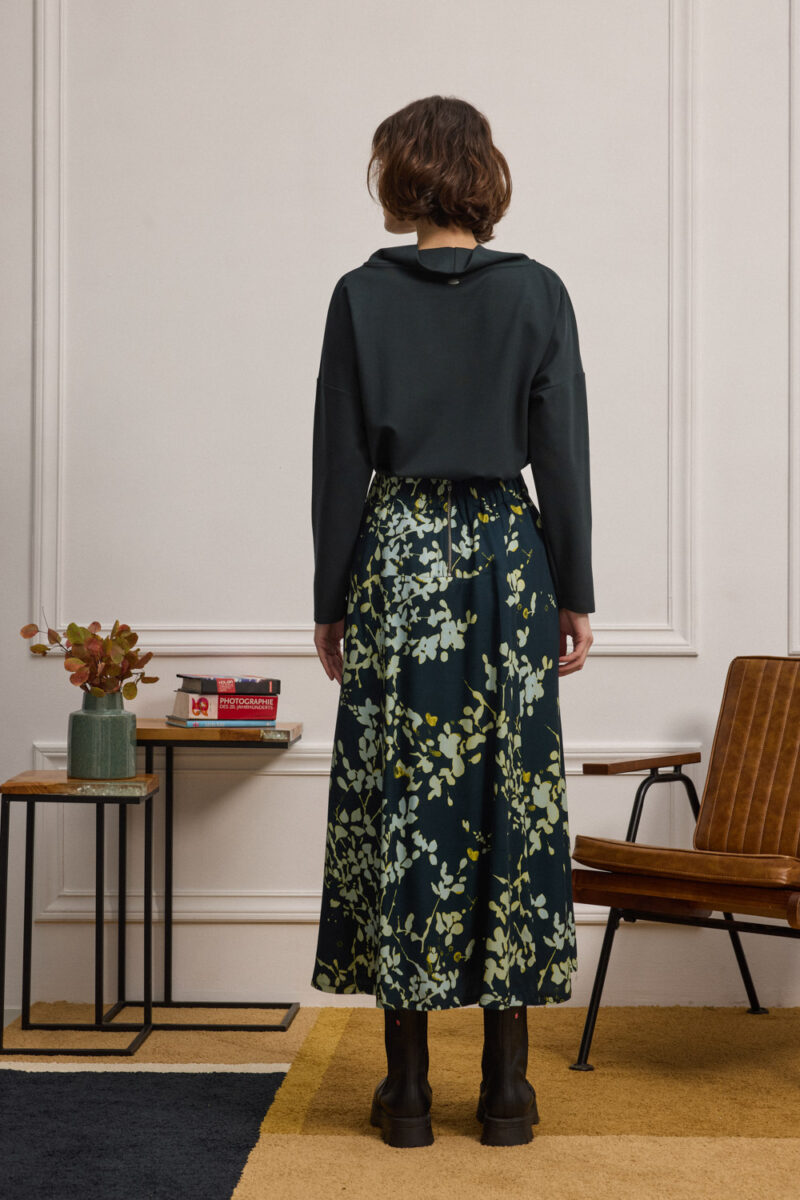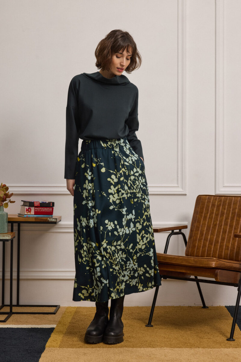 Midi φούστα σε εβαζέ γραμμή, με floral print σε αισθητική water color και ύφασμα από 100% viscoze Ecovero. Το λάστιχο στη μέση και το μεταλλικό φερμουάρ στο πίσω μέρος προσθέτει λεπτομέρεια και εξασφαλίζει άνετη εφαρμογή. Διαθέτει πλαϊνές τσέπες και αέρινη γραμμή που κολακεύει τη σιλουέτα. Φόρεσέ τη με το πουκάμισο SELKIE για ένα απόλυτα συντονισμένο και κομψό look. “Αυτό το προϊόν έχει φτιαχτεί με αγάπη και σεβασμό στο περιβάλλον χρησιμοποιώντας φυσικές ίνες.”