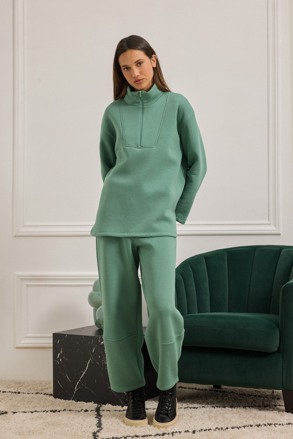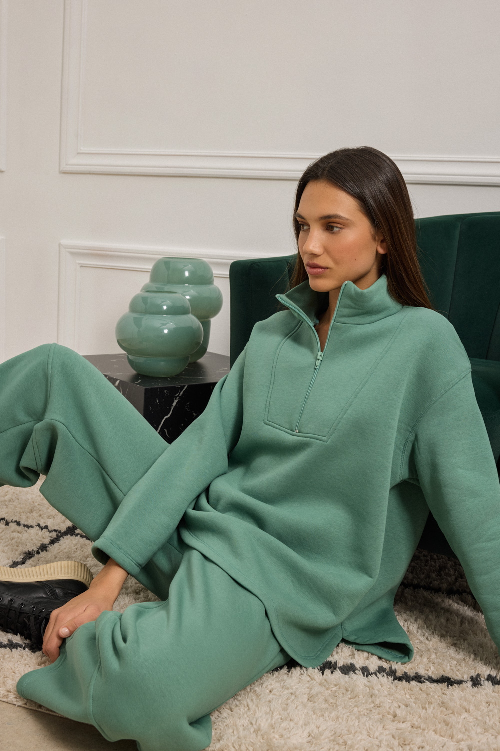 Μακρυμάνικο φούτερ με ζιβάγκο και φερμουάρ, σε ασύμμετρη γραμμή με στρογγυλεμένα τελειώματα, ιδανικό για άνετες αλλά στυλάτες εμφανίσεις. Το χαλαρό ζιβάγκο που κλείνει με φερμουάρ προσθέτει ιδιαίτερο χαρακτήρα, ενώ η άνετη γραμμή εξασφαλίζει αίσθηση χαλάρωσης. Το σχέδιο ξεχωρίζει χάρη στα διακριτικά κοψίματα στο μπροστινό μέρος, που χαρίζουν μοντέρνα αισθητική και αναβαθμίζουν το casual look. Το μήκος και η ασυμμετρία δίνουν στο φούτερ μια μοναδική σιλουέτα, ιδανική για all-day styling. Συνδυάζεται ιδανικά με το παντελόνι GOKU, δημιουργώντας ένα ολοκληρωμένο και ισορροπημένο σύνολο για κάθε στιγμή της ημέρας.