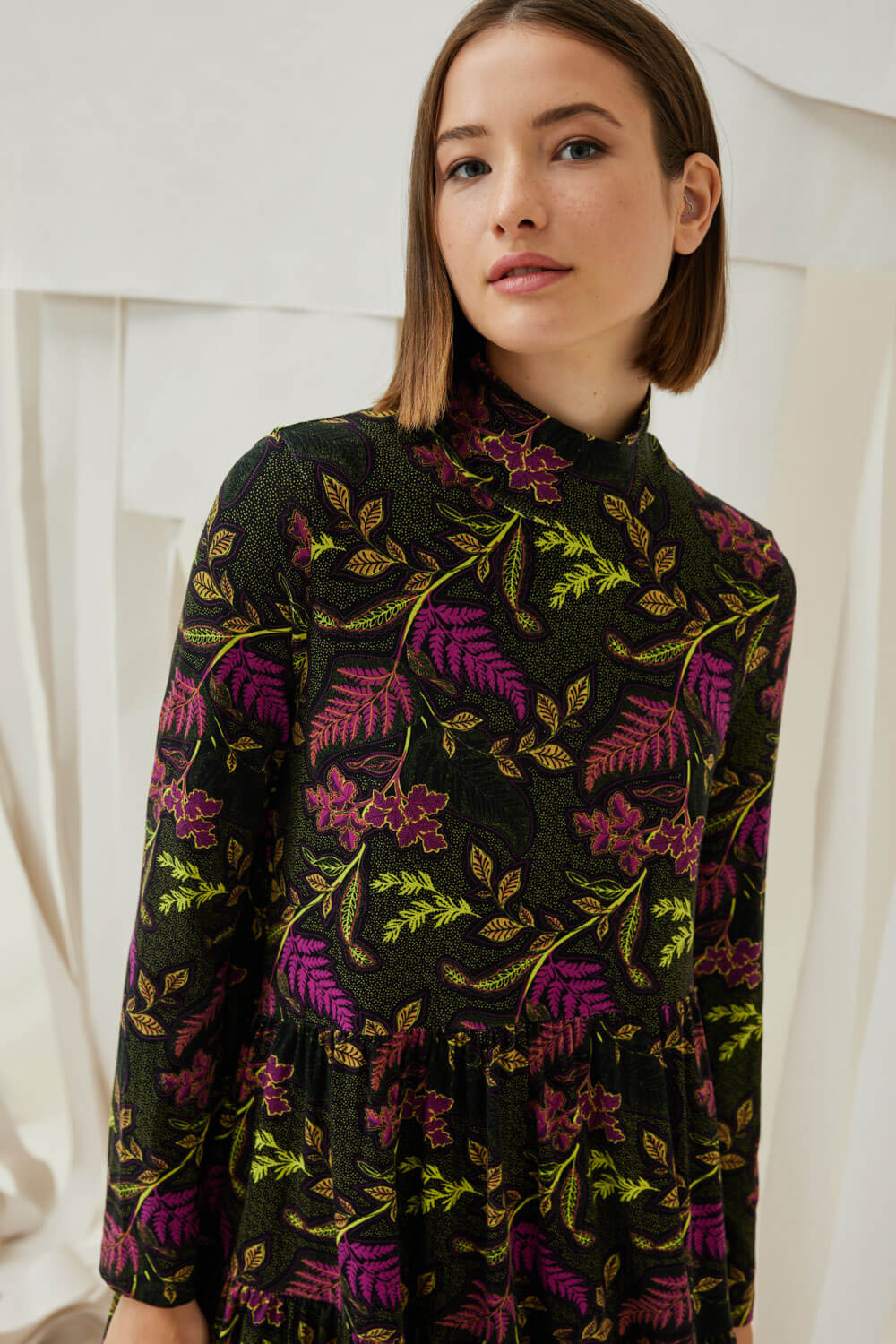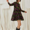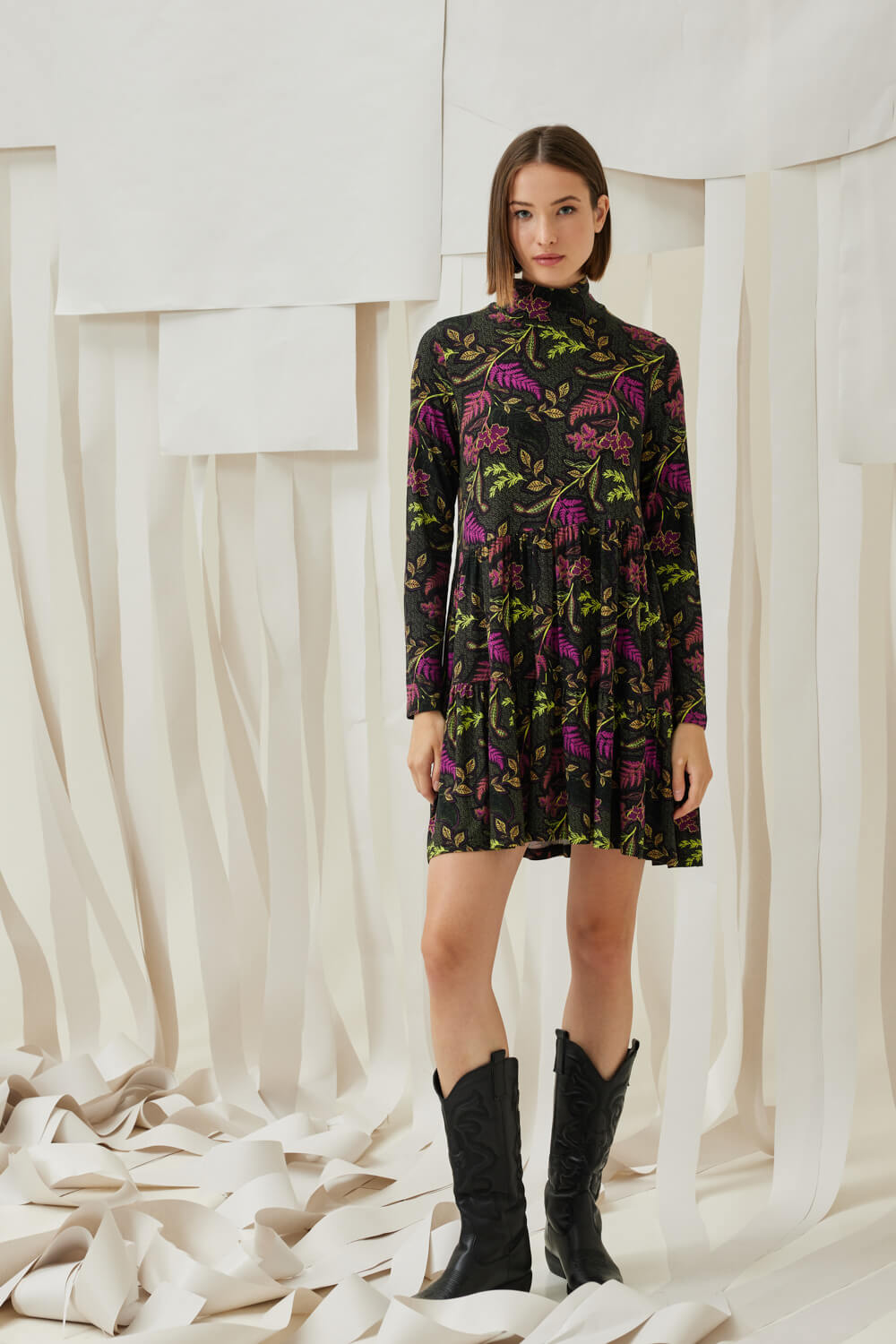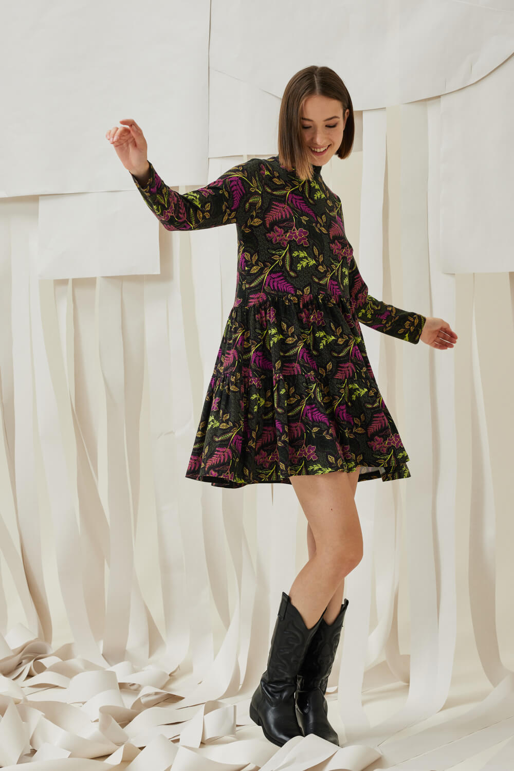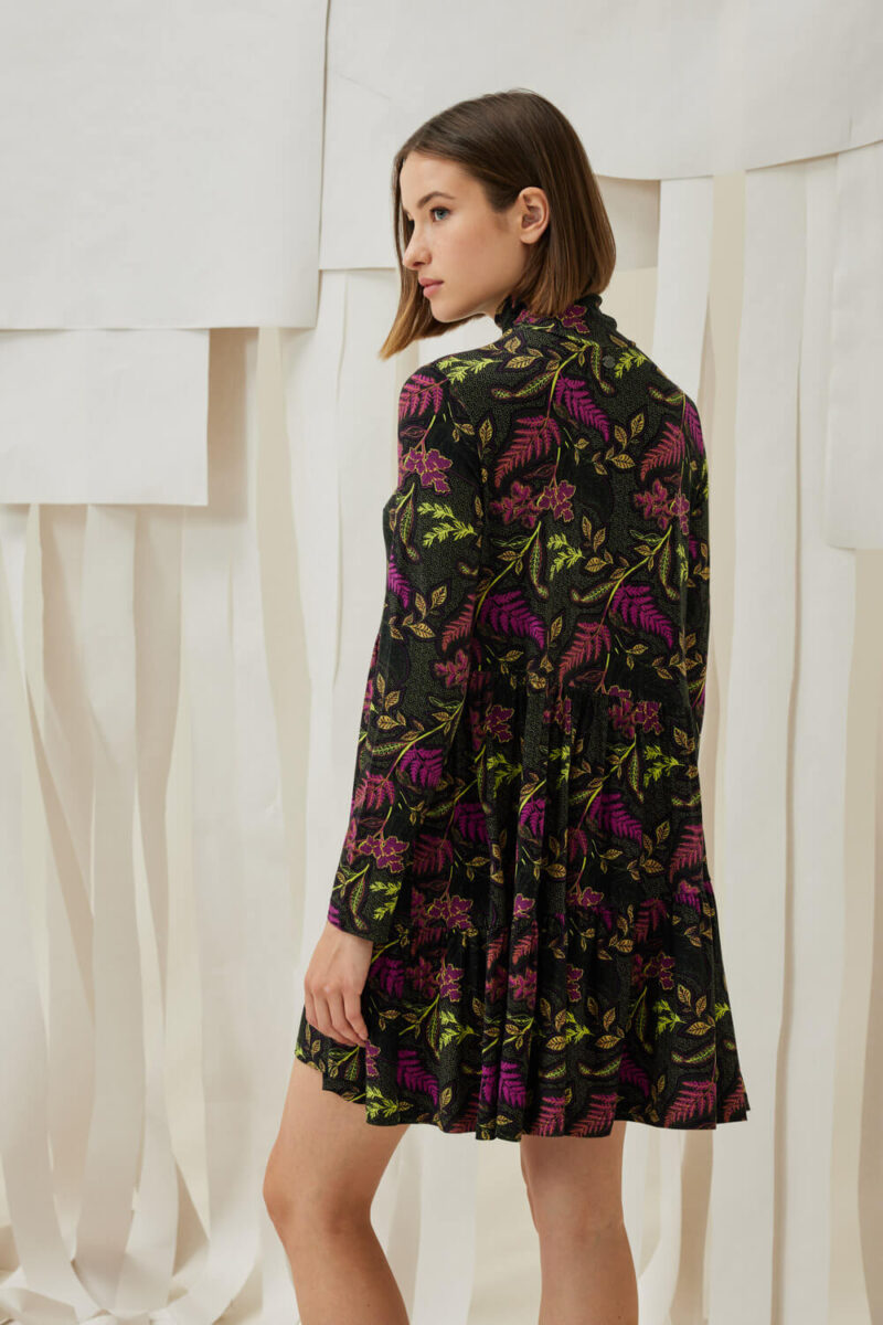 Mini ζέρσευ εμπριμέ φαρδύ φόρεμα με ασύμμετρα βολάν και μακρύ μανίκι.