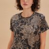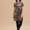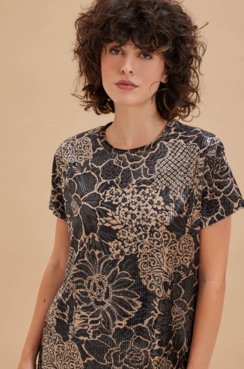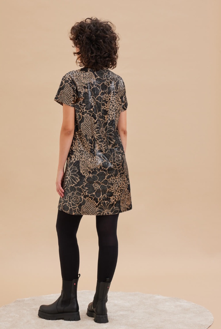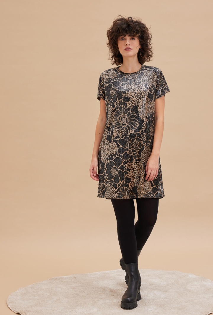 Φόρεμα mini κοντομάνικο σε ίσια γραμμή, σε ύφασμα εμπριμέ βελουτέ με παγιέτες , στις αποχρώσεις του μπεζ και του μαύρου.+Ιδανικό για βραδινές εμφανίσεις.