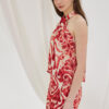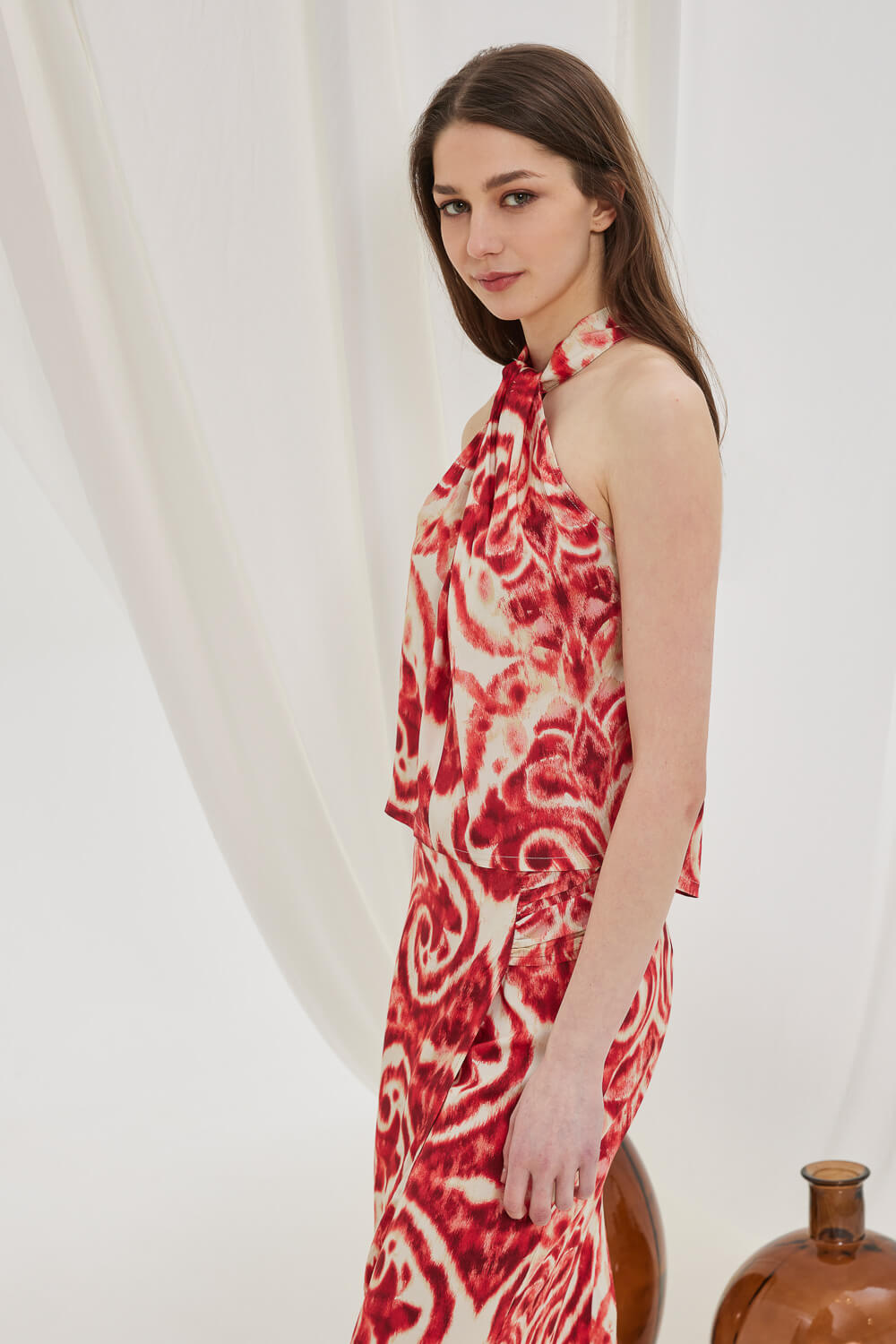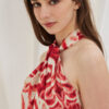 Αμάνικο top με παρτούς ώμους, σχέδιο στο λαιμό εμπρός που δημιουργεί σούρες και ξύλινο κούμπωμα και άνοιγμα πίσω.