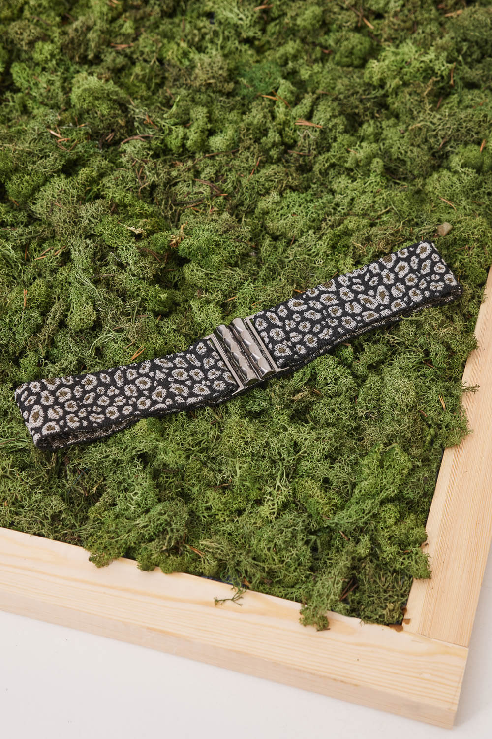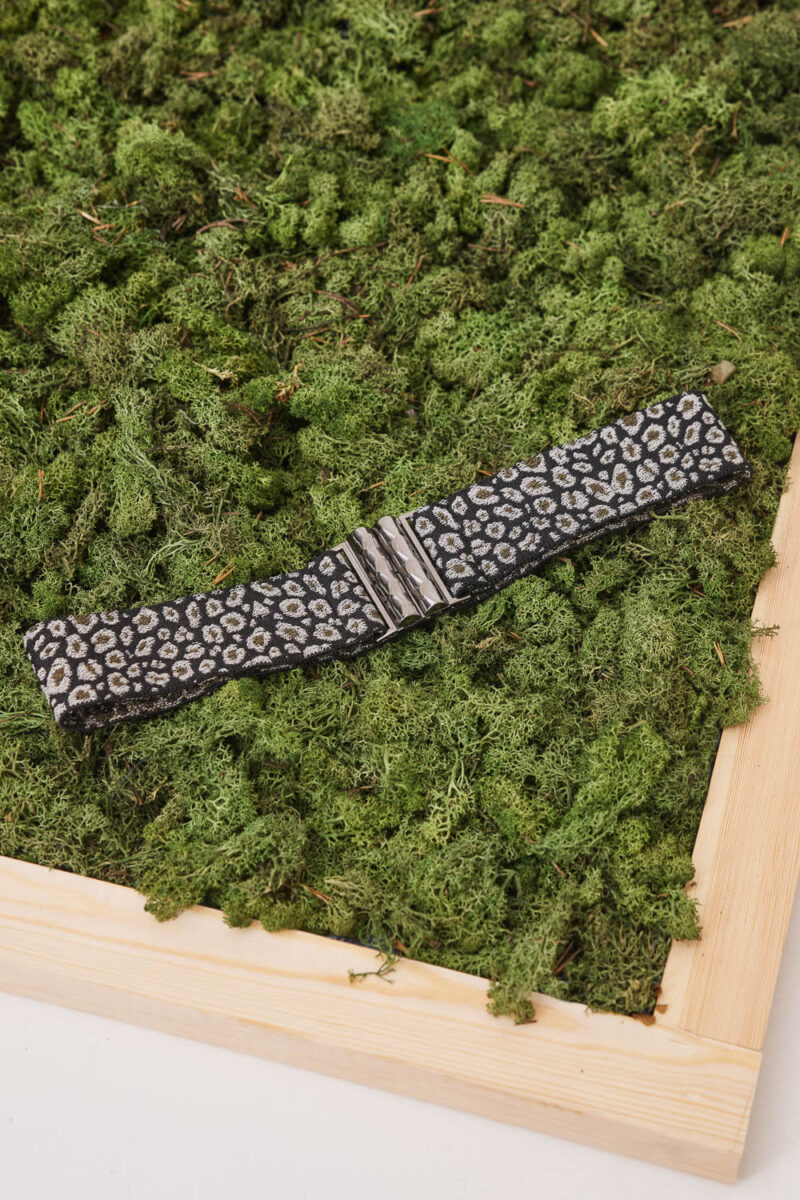 Εμπριμέ ελαστική ζώνη με μεταλλικό κούμπωμα. Συνδυάζεται απόλυτα με τα μονόχρωμα φορέματα.